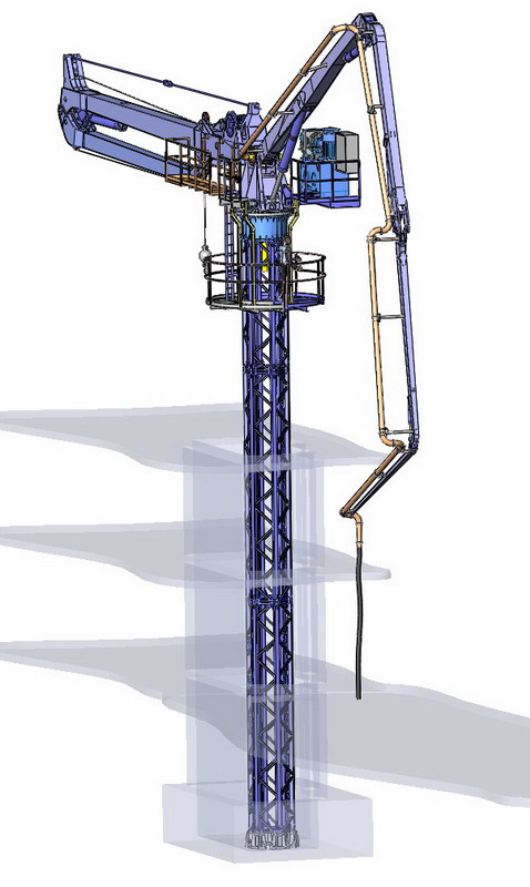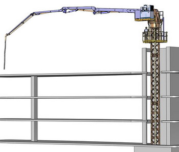 Concrete placing boom and knuckled crane on the single tower - CBC Innovative design of the concrete placing boom and knuckled crane installed on the single tower have been developed for construction companies. On the one side of the tower is the concrete placing boom, 28 m horizontal reach, it has been designed with advanced features to provide efficient and total coverage in entire boom radius. On the opposite side, is the knuckle crane, capacity 20 tonnes, and is able to lift load from its own shaft. Some solutions for these projects has been patented.
