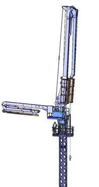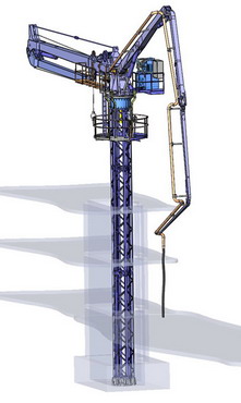 This was a innovative project in the development and design of the concrete placing boom and the knuckle crane installed on the single tower. The special hexagonal tower is designed to suit both options, free standing and self-climbing for the whole system. The four stages concrete placing boom reaches 30 m horizontally. On the placing boom is installed 125 mm (5") concrete delivery pipeline. The boom has Z-folded connection between the second and the third stage and provides complete coverage of pumping in its reach. On the opposite side of the concrete boom is the two stage-knuckled crane, maximum capacity 20 tonnes, 2.0 tonne on the tip of the crane with horizontal reach 25 metres. The winch is installed on the crane's first stage. The operating platform is designed to rotates with the turret and provide lifting a load just next to the tower. The power pack is located on the turret platform. The tower can rotate endlessly using designed the slip ring unit.