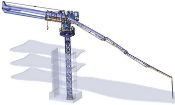 Milop engineer is a co-author of the patent for solutions in this project. This coupled combination of the crane and concrete placing boom on a single tower enables the efficient use of the working deck on a multistorey building. The tower can be installed in the shaft or anywhere in slabs openings. |