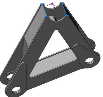 FEA stresses in the linkage. The overstressed parts are shown in red colour. CAD model of the linkage